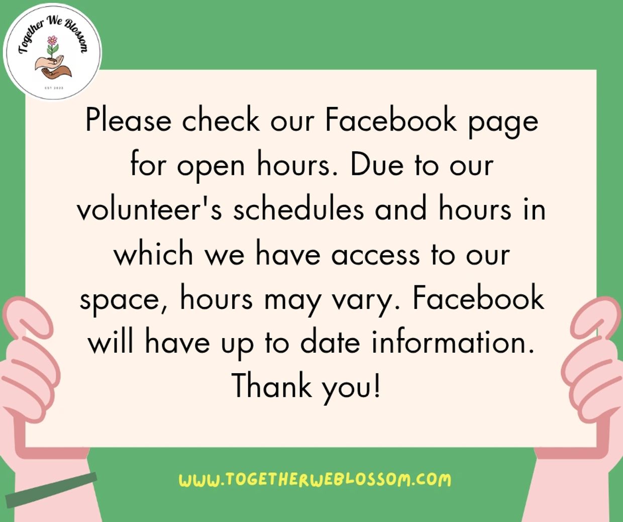 We partner with local businesses, organizations, and generous donors to keep our racks and shelves stocked and our service running smoothly. By fostering a sense of community and providing essential resources, Together We Blossom strives to make a positive impact on the lives of those we serve.